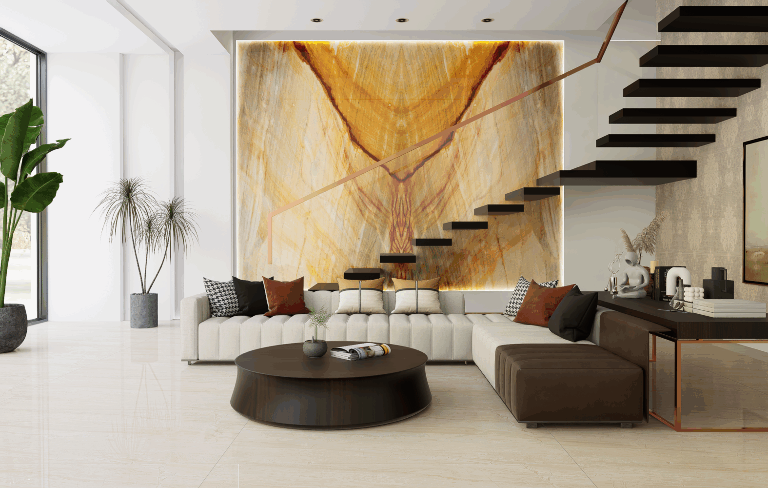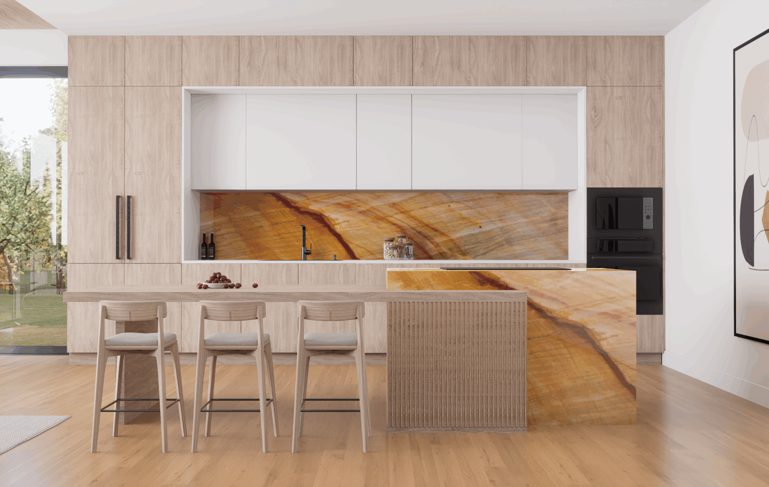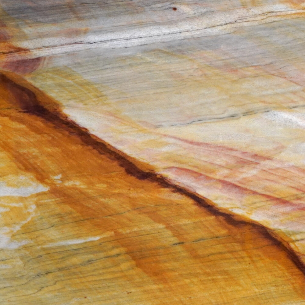 Originating from Brazil, Apache Quartzite showcases warm golden ochre, beige, and subtle red tones, with flowing, organic patterns reminiscent of a desert landscape. This stone complements both rustic and modern styles, adding a sophisticated, natural element to any space.