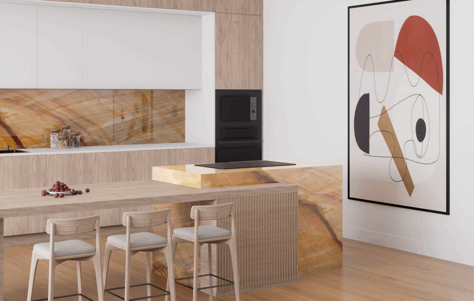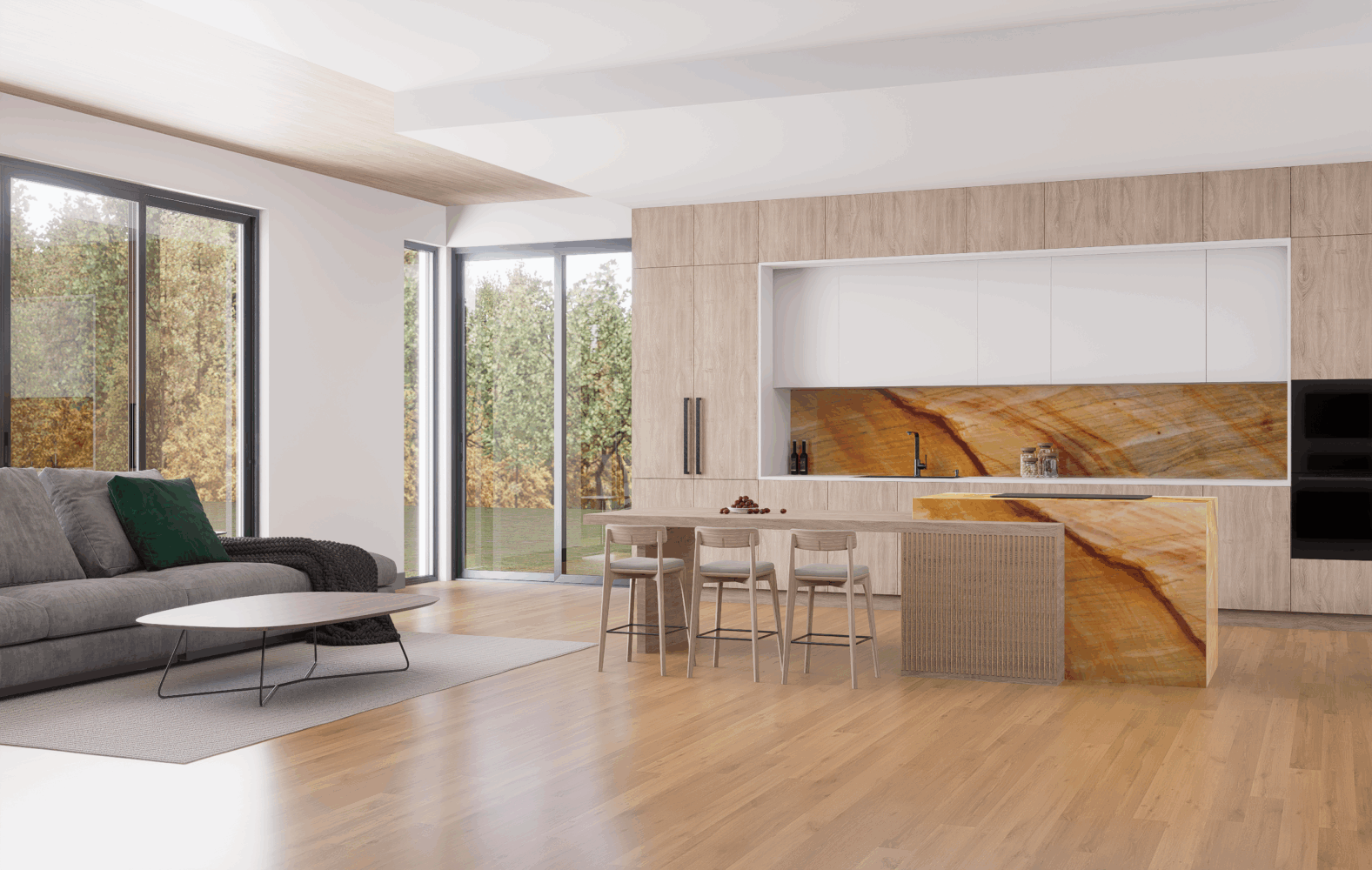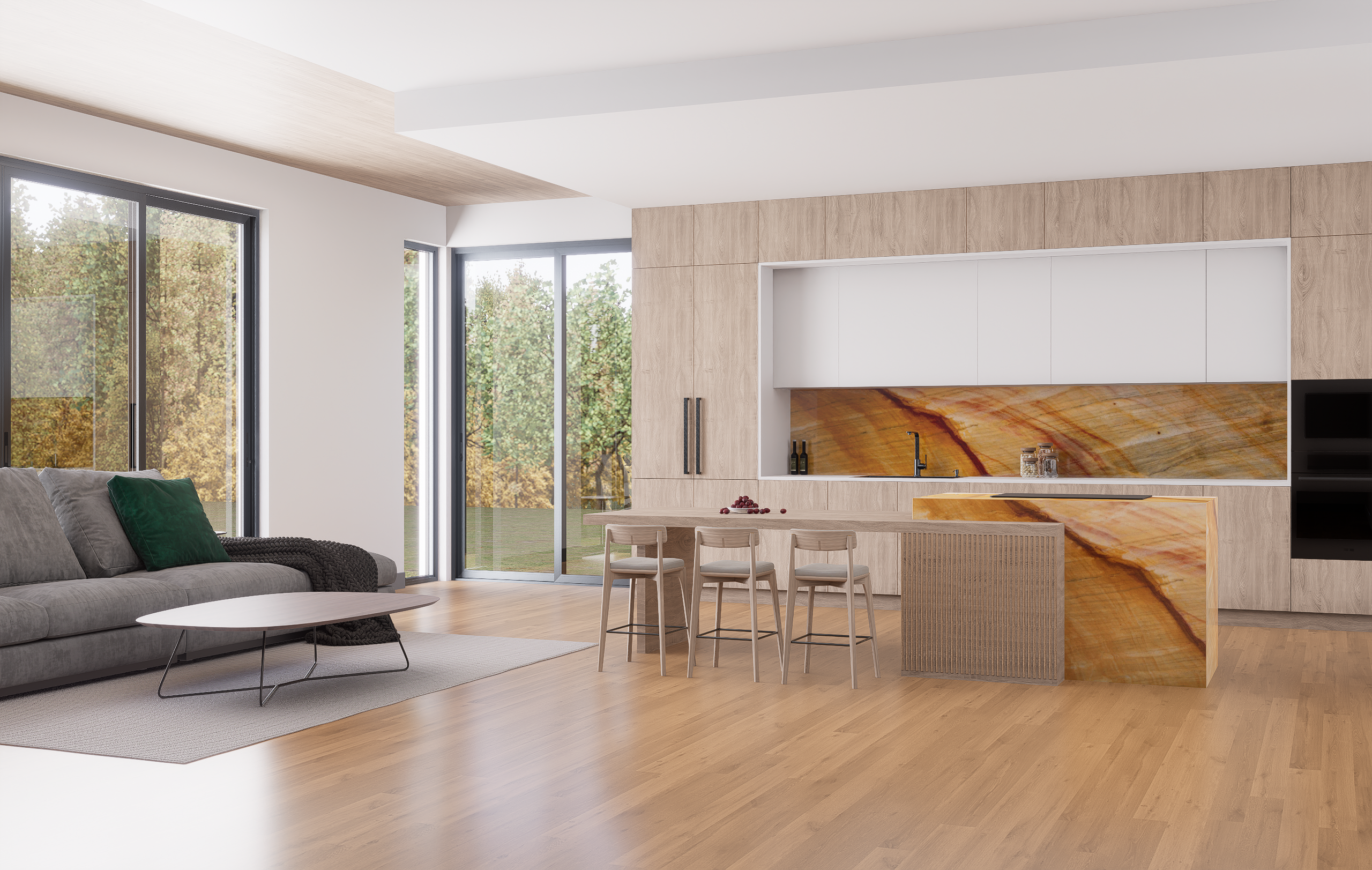 Originating from Brazil, Apache Quartzite showcases warm golden ochre, beige, and subtle red tones, with flowing, organic patterns reminiscent of a desert landscape. This stone complements both rustic and modern styles, adding a sophisticated, natural element to any space.