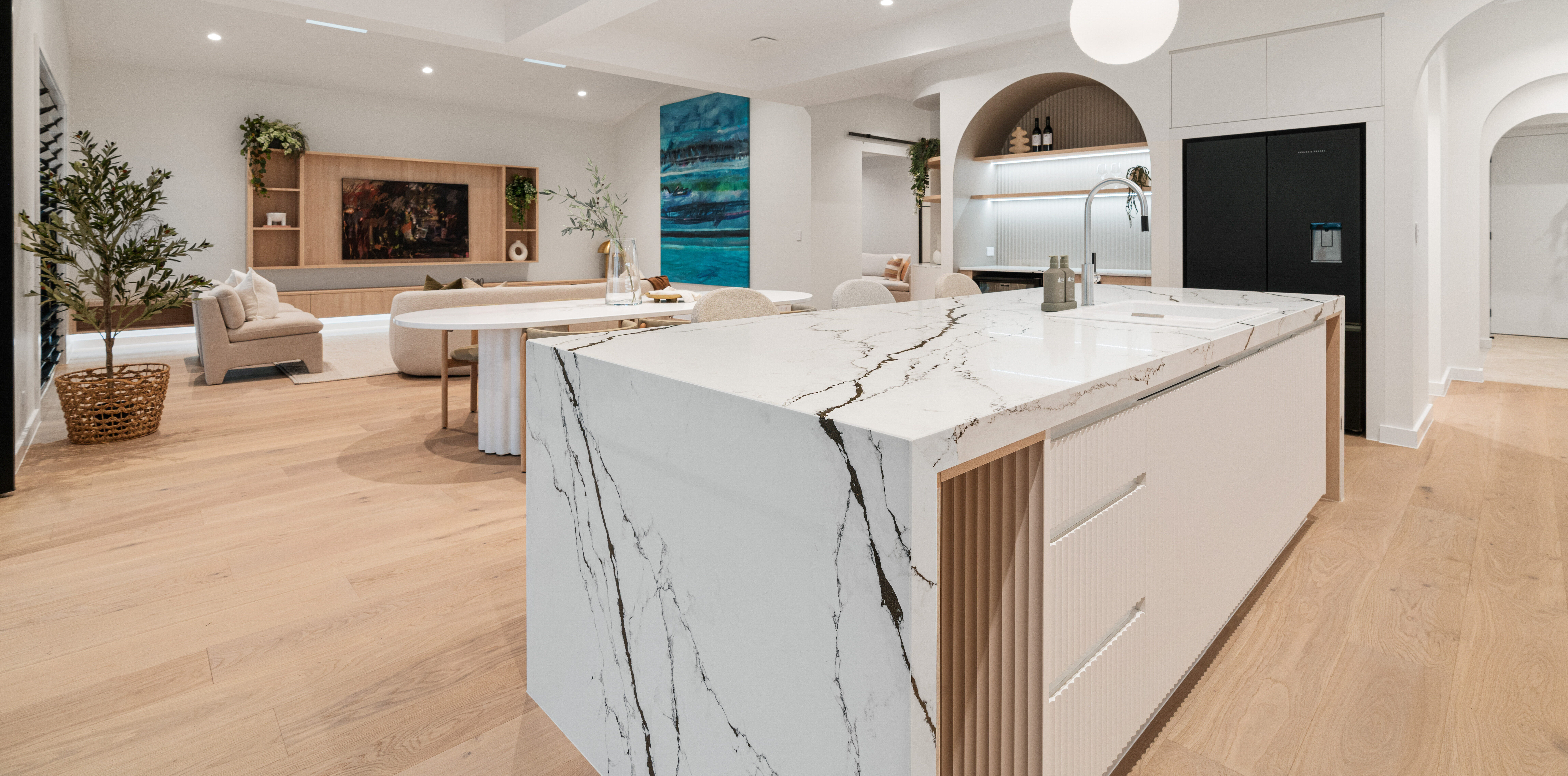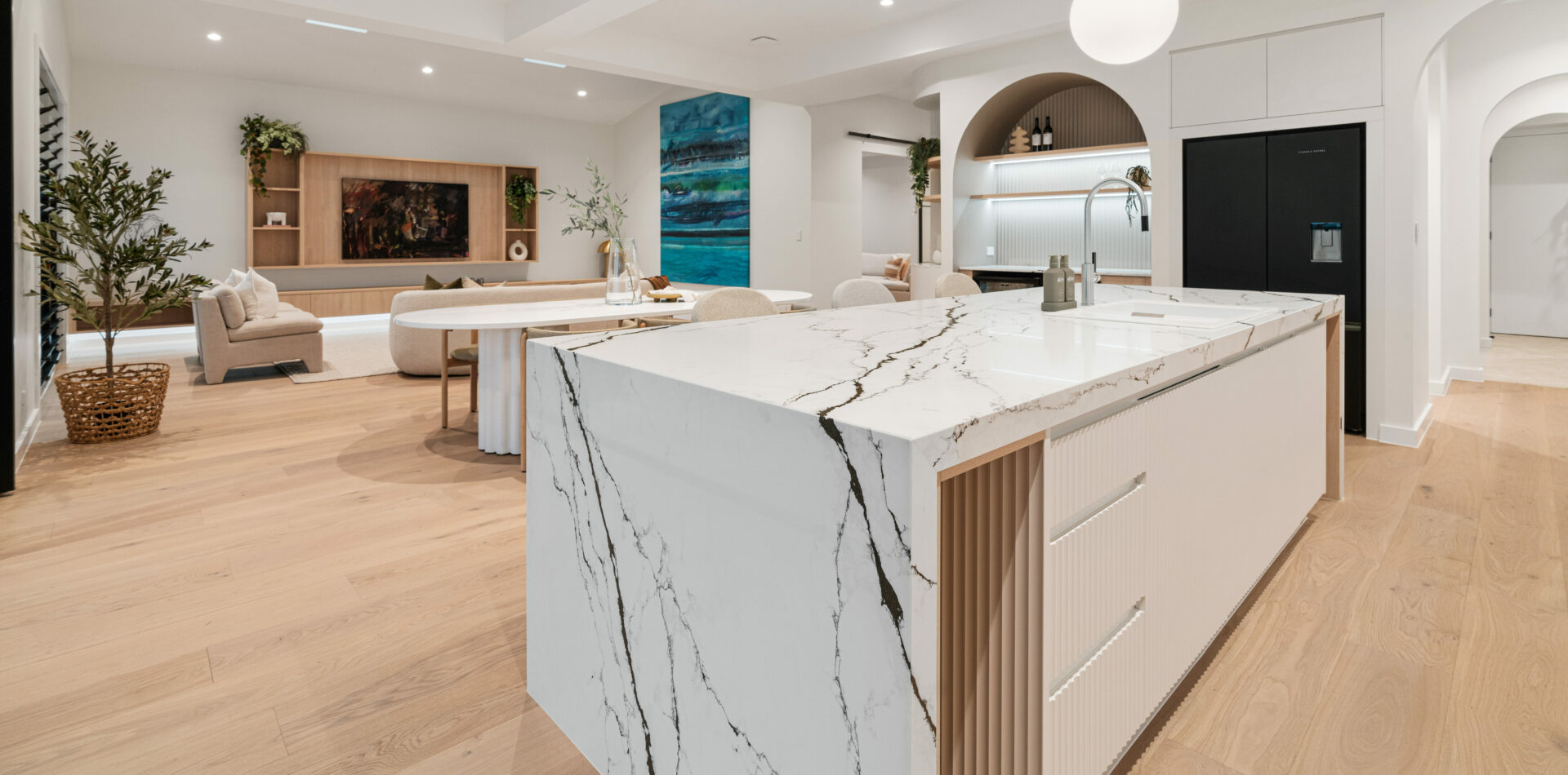 Introducing the captivating Astoria which entails striking bold veins on a glossy white background. The magic of this stone lies in its exquisite detail, as delicate threads of gold glitter are intricately infused within the dark veins. This marbled like pattern is perfect for those wanting a touch of Italian luxury.