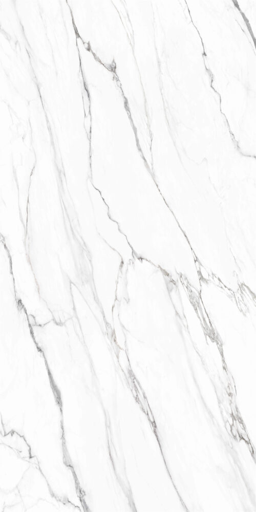 This stone has a snowy white background with prominent grey Calacatta veins flowing throughout it, giving it a striking and elegant look.