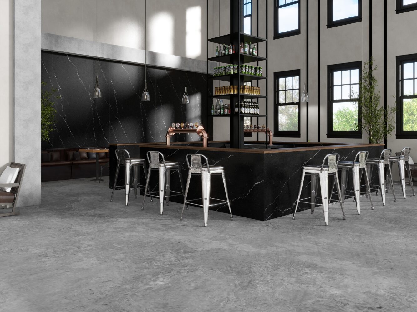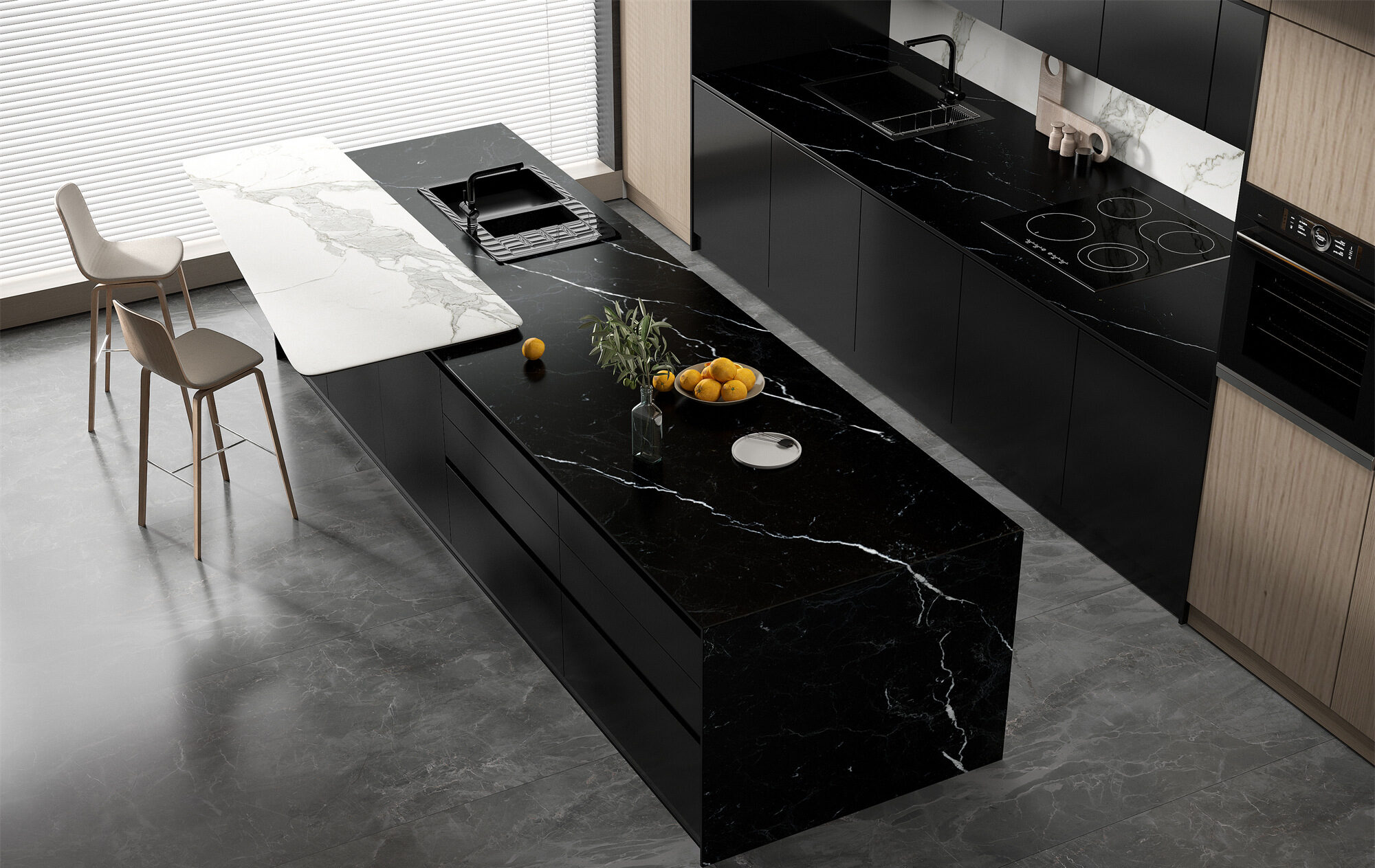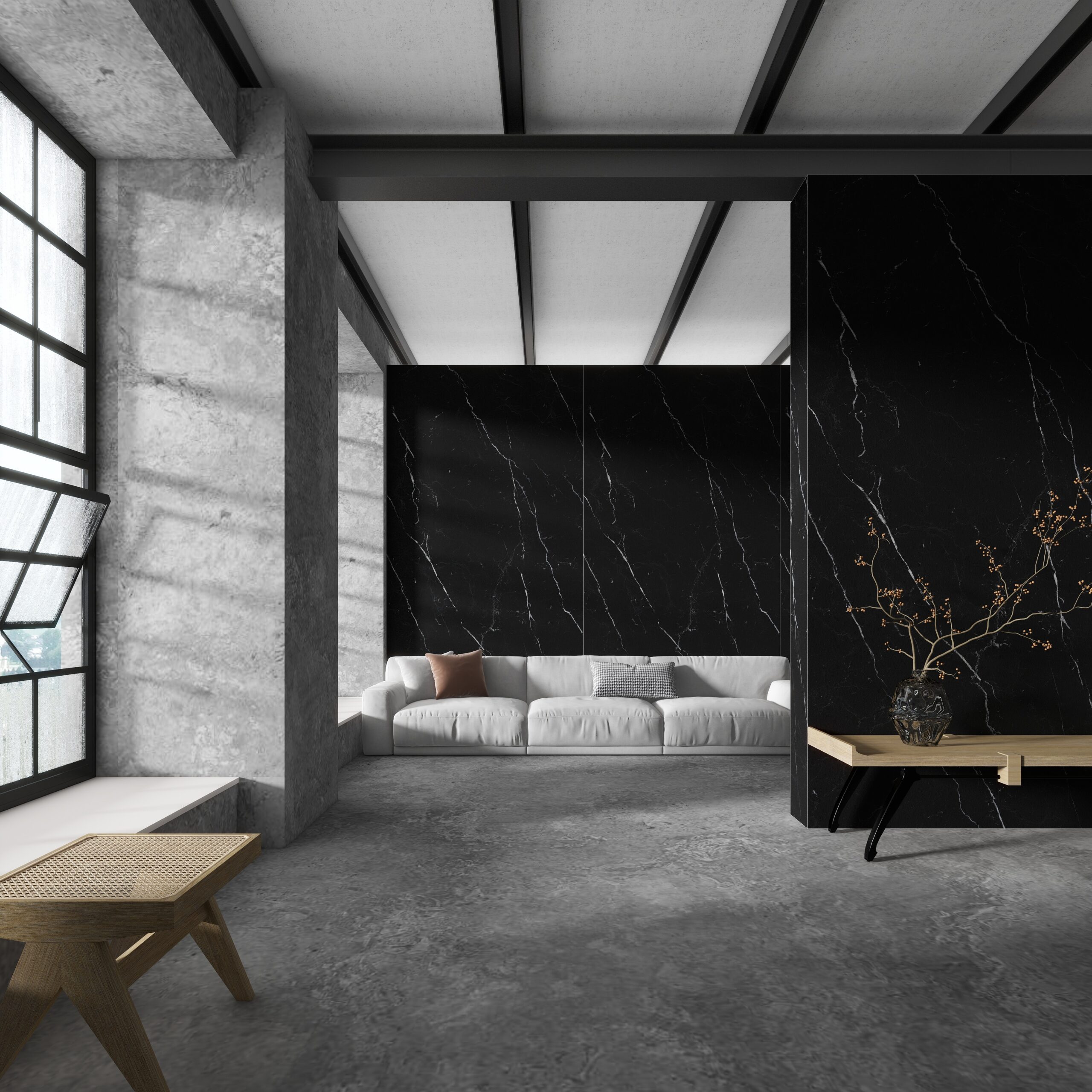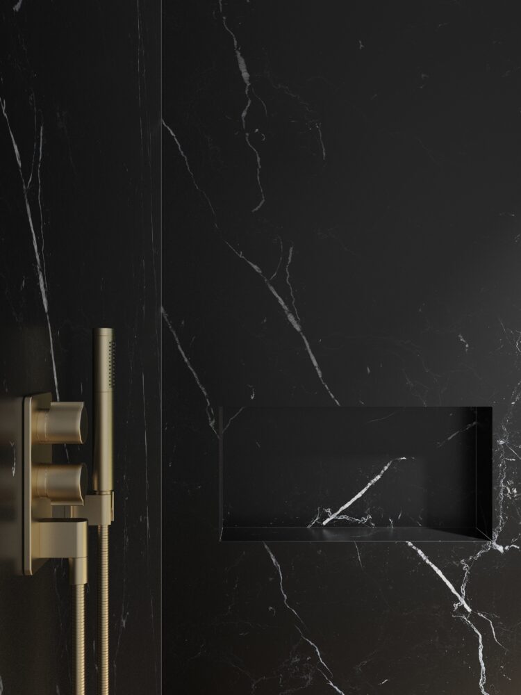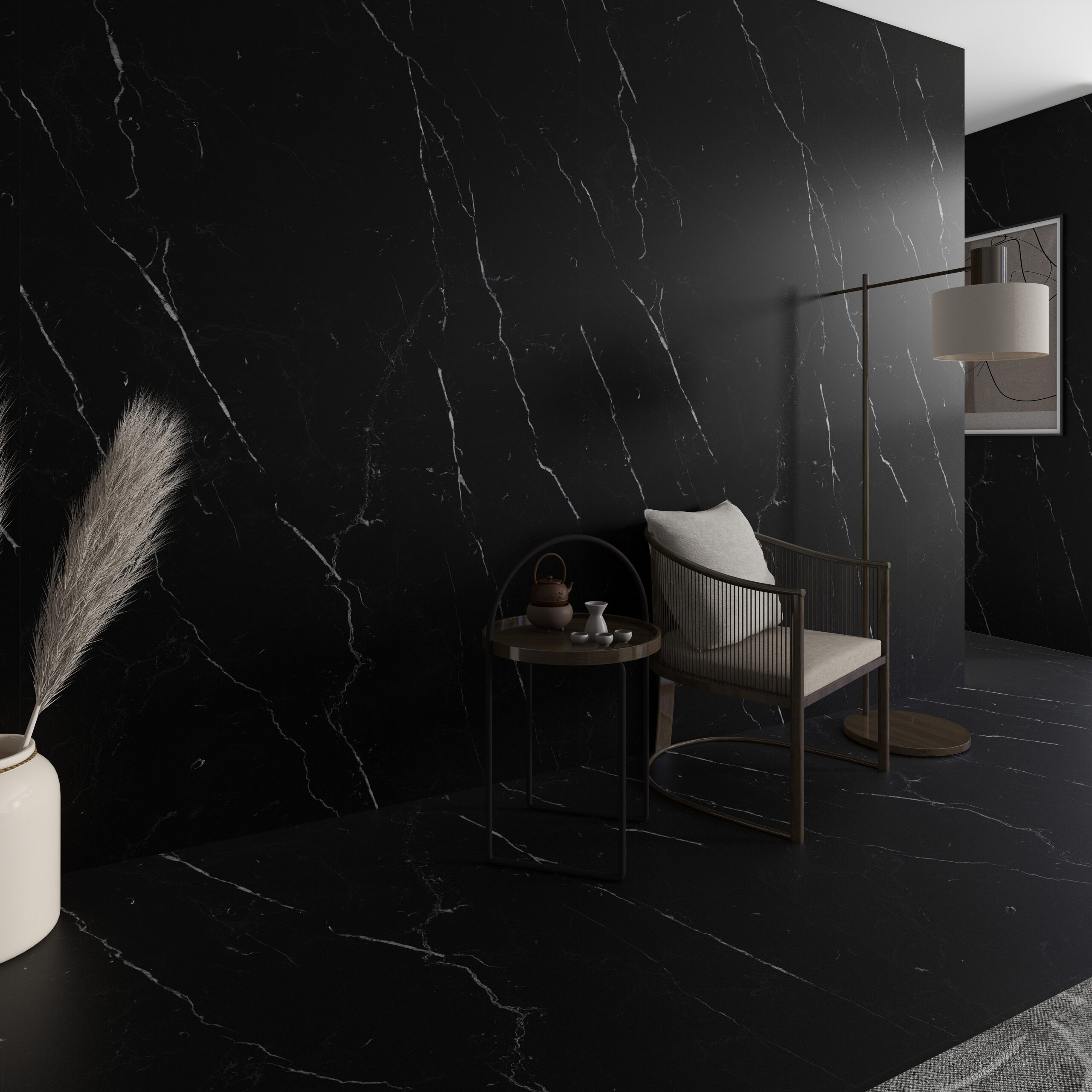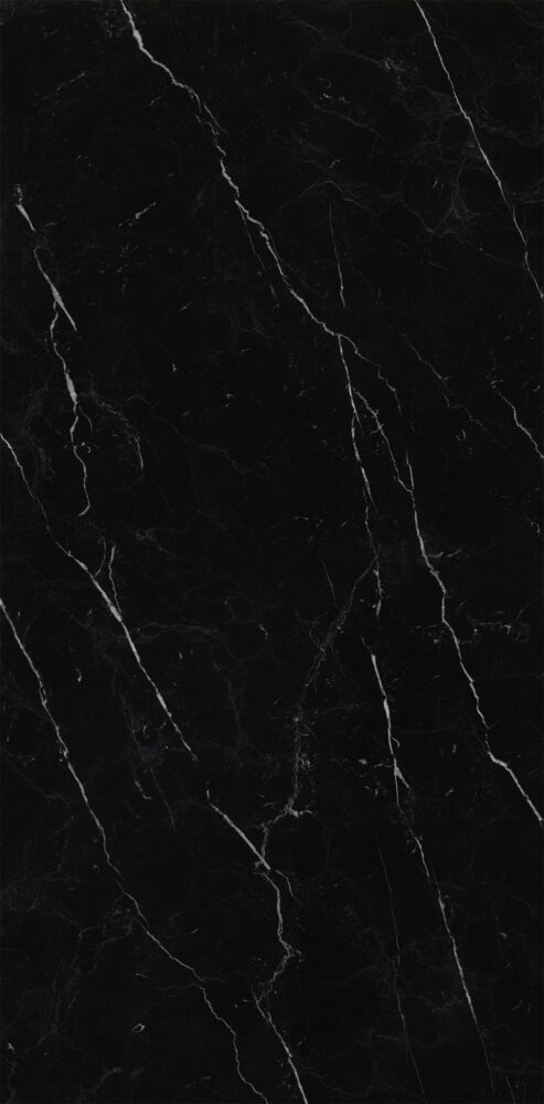 Uncover our exquisite black porcelain, infused with arbitrary, vivid white veins, creating a striking and elegant modern aesthetic.