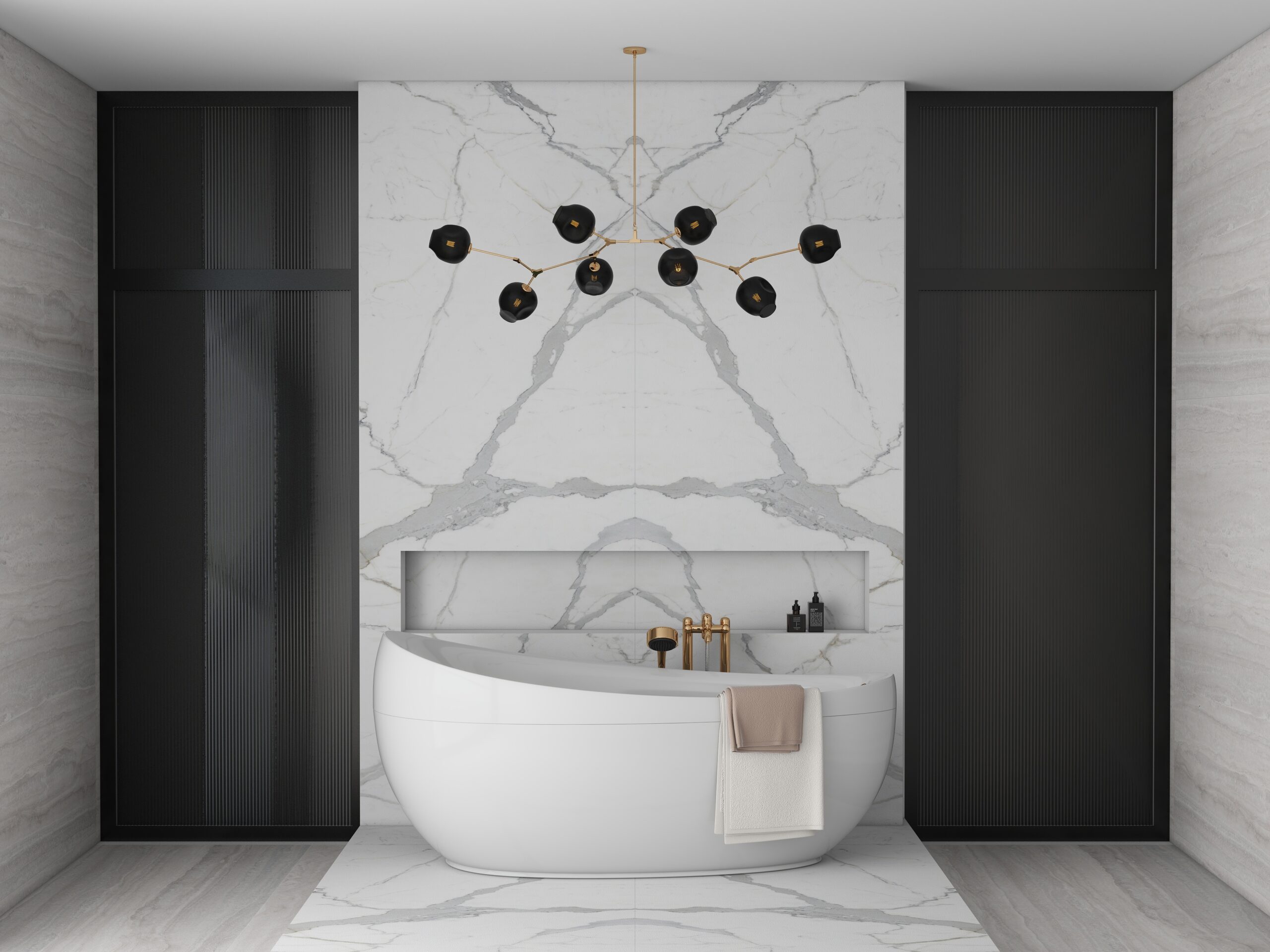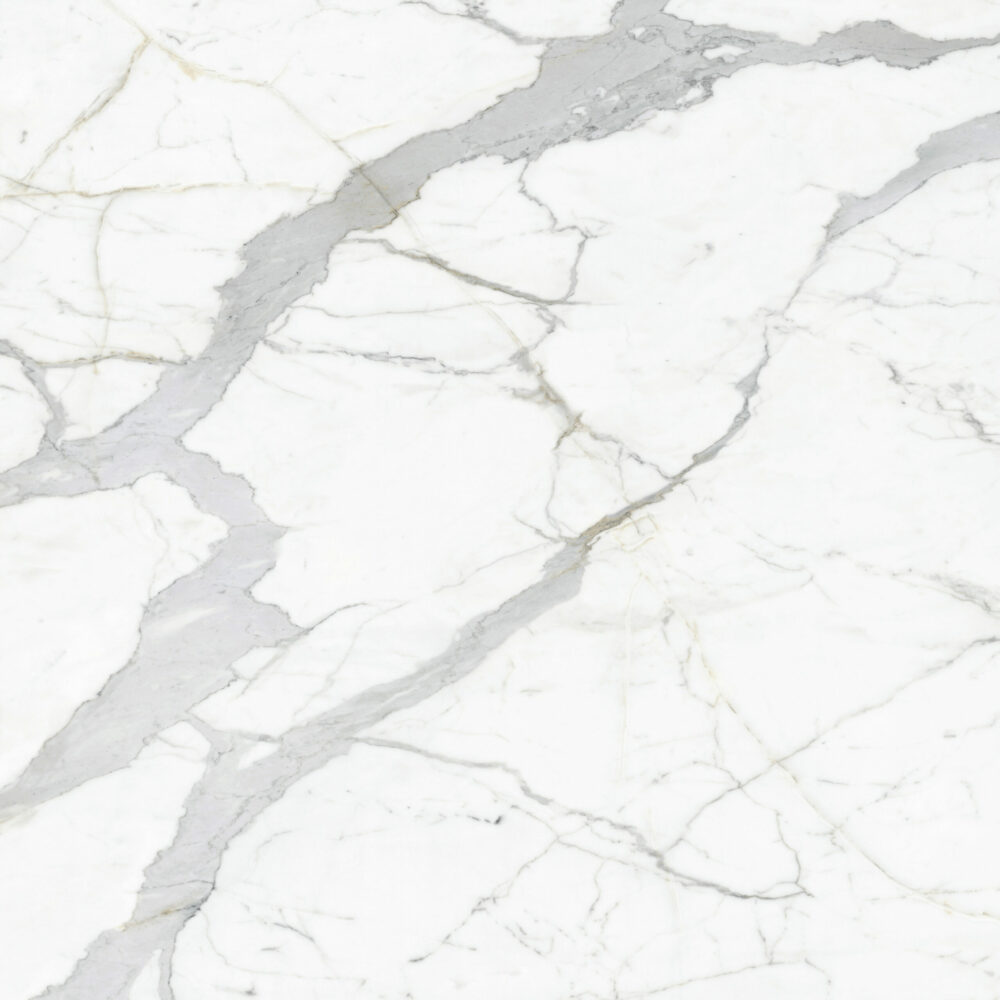 The canvas predominantly features a pristine white background embellished with bold light grey accent veins. These beautiful Calacatta veins exhibit a diverse range of volumes, with some parts being bold and others soft.