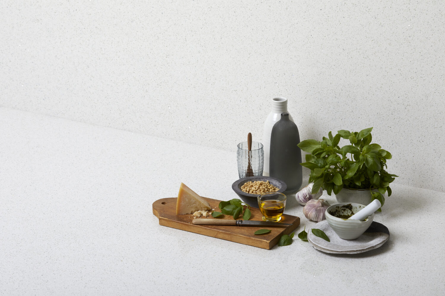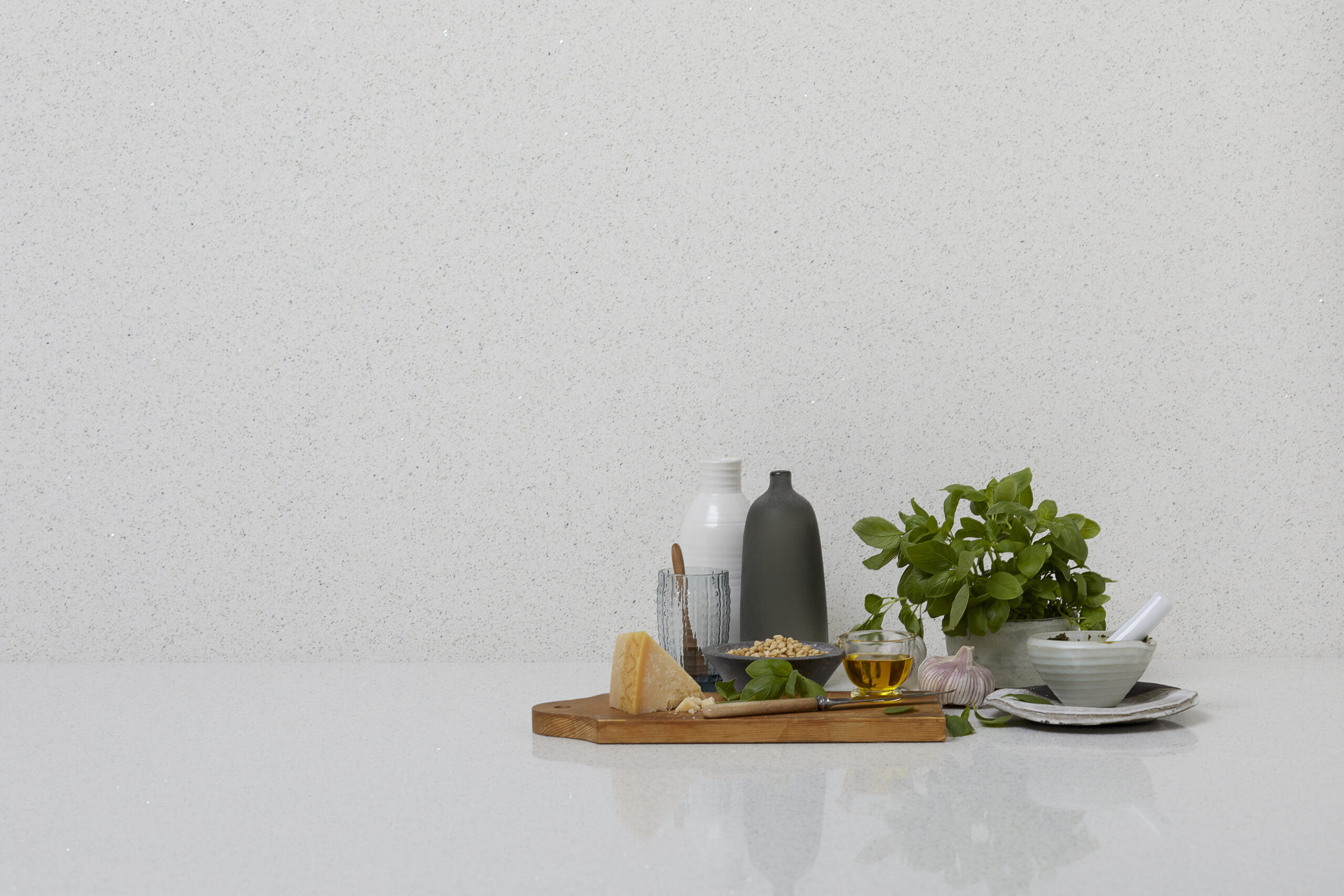 A crisp white stone featuring delicate crystalline speckles that shimmer subtly across the surface. Its refined texture adds depth and visual interest, making it a versatile choice for any space.