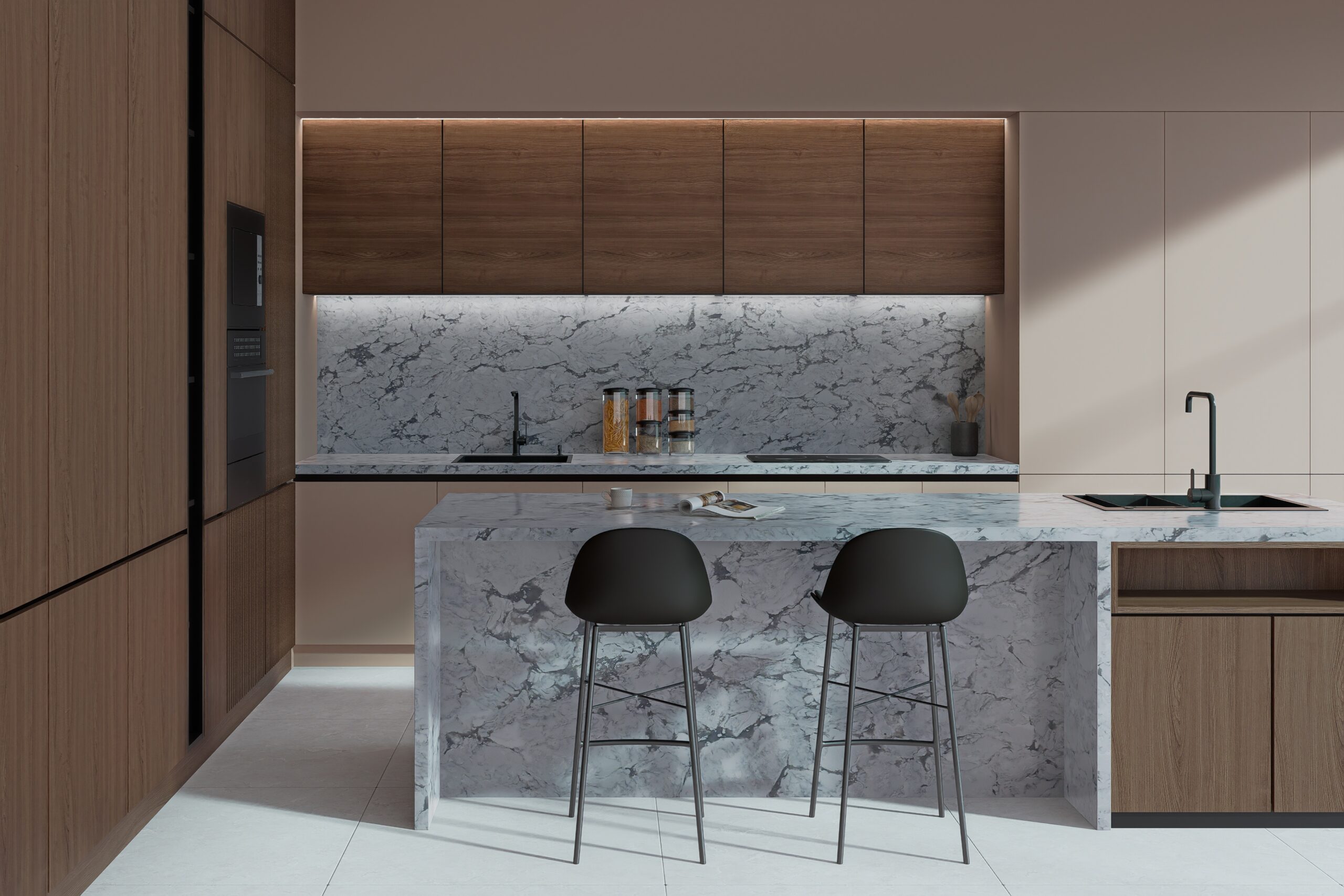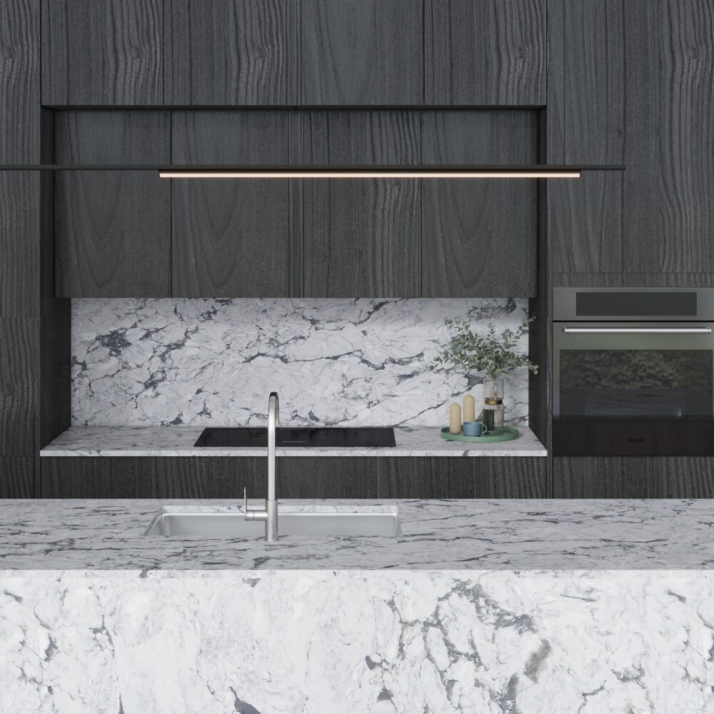 Inspired by Brazilian quartzite Super White. Our Supernova offers a beautiful warm grey background exquisitely mimicking a modern concrete stone surface. The flowing dusk vein patterns, perfectly adds an exclusive and timeless feeling and brings style to any interior.