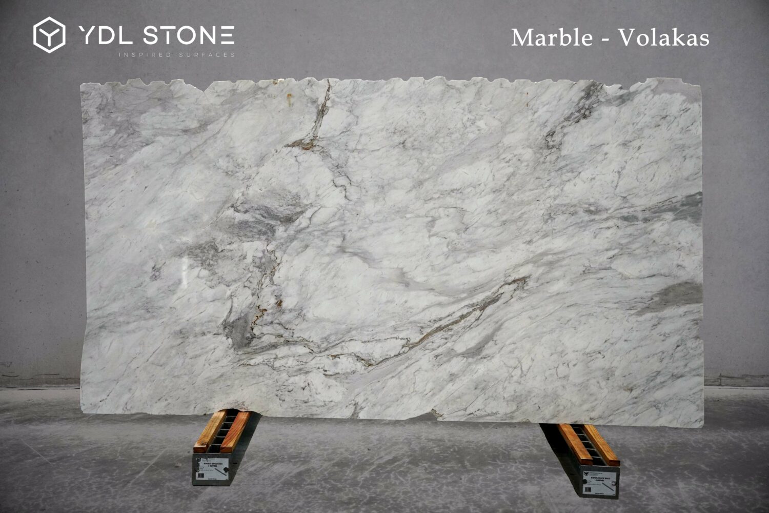 Volakas marble from Greece showcases a striking pattern, with sweeping grey veins that weave across its white base in bold, organic lines. These veins vary in intensity, creating depth and contrast, while hints of earthy brown add warmth and complexity to the design. The intricate, layered patterns give each slab a unique, flowing character that draws the eye and brings a sense of movement to any setting.